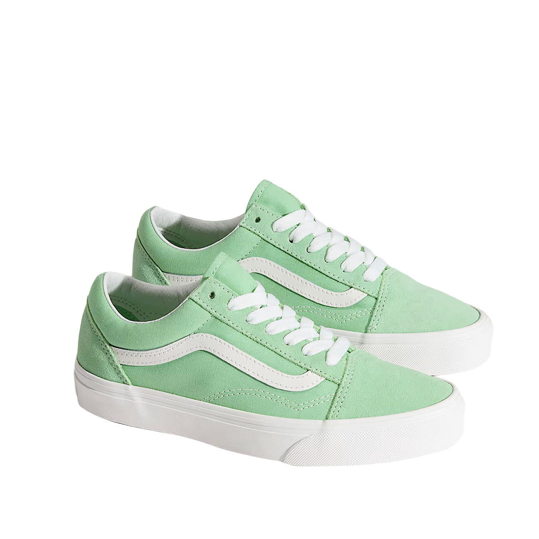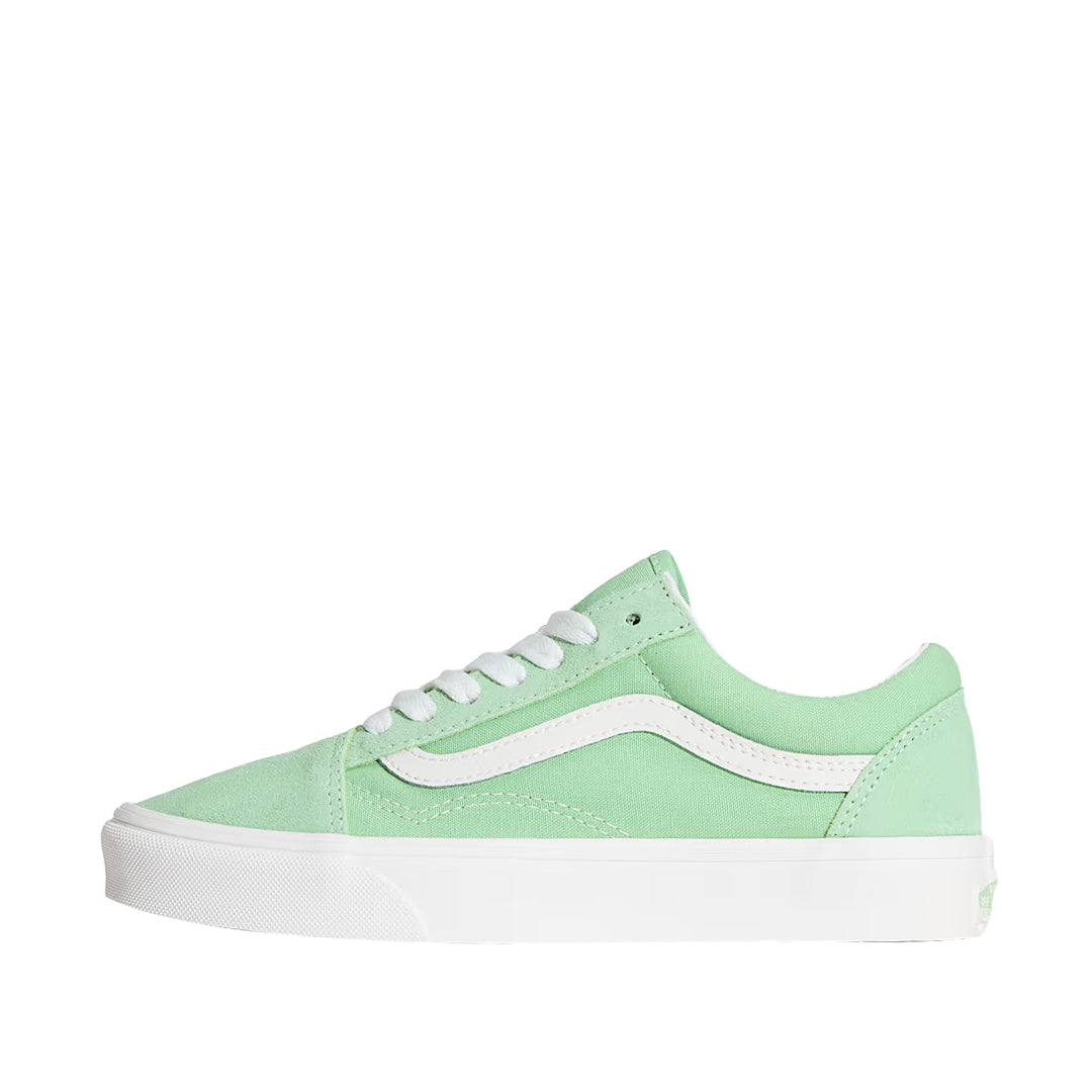 Tennis O-Skool para mujer en color verde (Vans). Silueta retro con upper de lona resistente, cuello acolchado y suela waffle vulcanizada que aporta tracción y durabilidad para el uso diario.