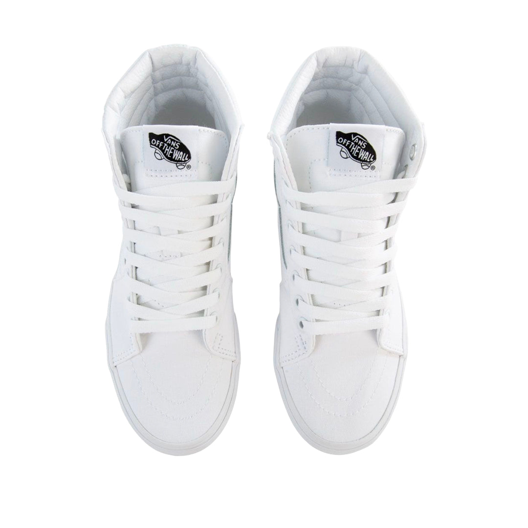Tennis Sk8 Hi unisex color blanco, el icónico modelo Sk8-Hi se actualiza con plataforma y materiales resistentes de lona y gamuza. Su cuello acolchado y suela waffle garantizan soporte, durabilidad y estilo atemporal.