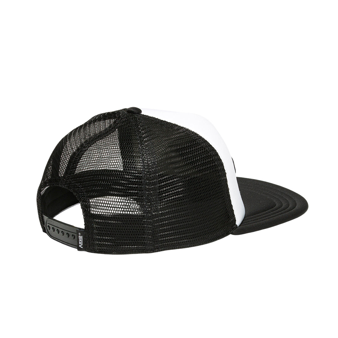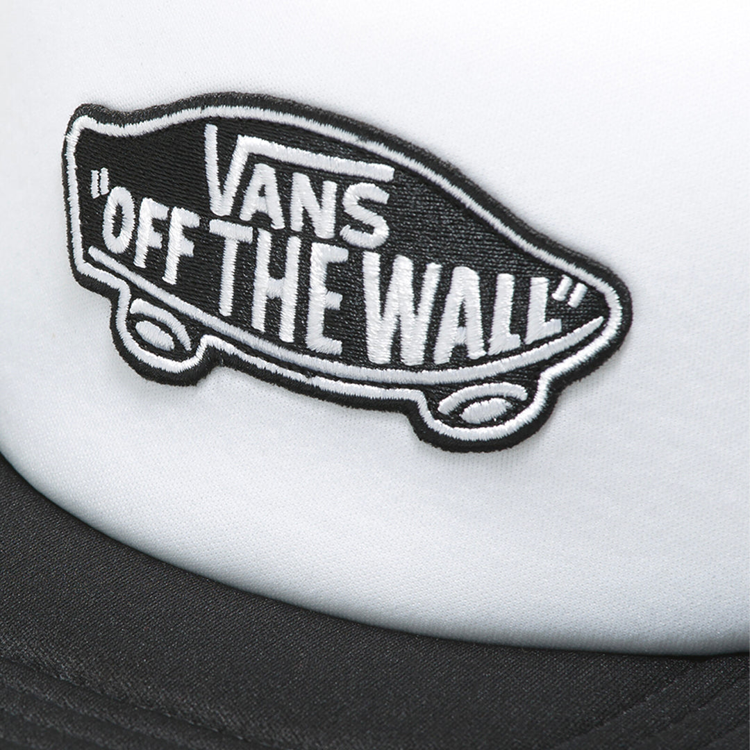 Gorra Pa Truck unisex en blanco y negro, confeccionada en malla 100% poliéster. Presenta cierre ajustable en la parte posterior y parche frontal con logotipo Vans Off The Wall. Diseño liviano y transpirable, ideal para uso diario.