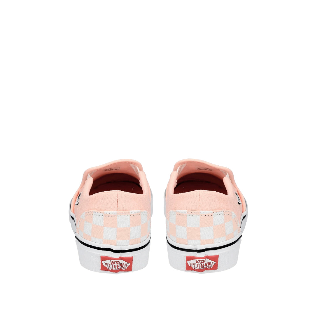Tennis Asher para mujer color rosado y blanco, marca VANS. Slip-on con upper textil, plantilla acolchada y suela waffle para comodidad diaria.