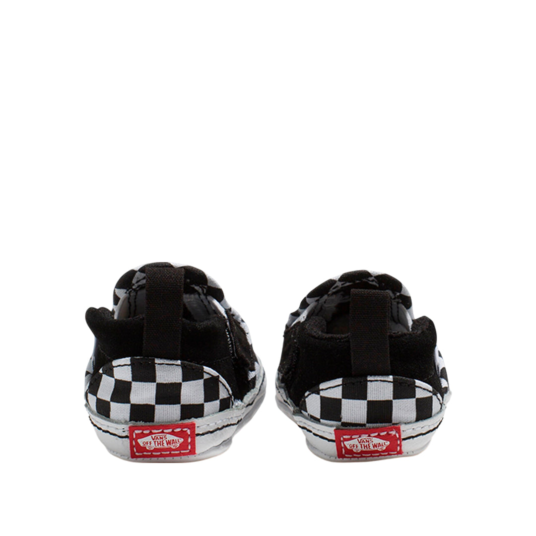 Tennis Slip On V para niño color negro y blanco, marca VANS. Parte superior de lona y ante con estampado checkerboard. Cierre de velcro lateral, insertos elásticos y tirador trasero. Suela waffle duradera.