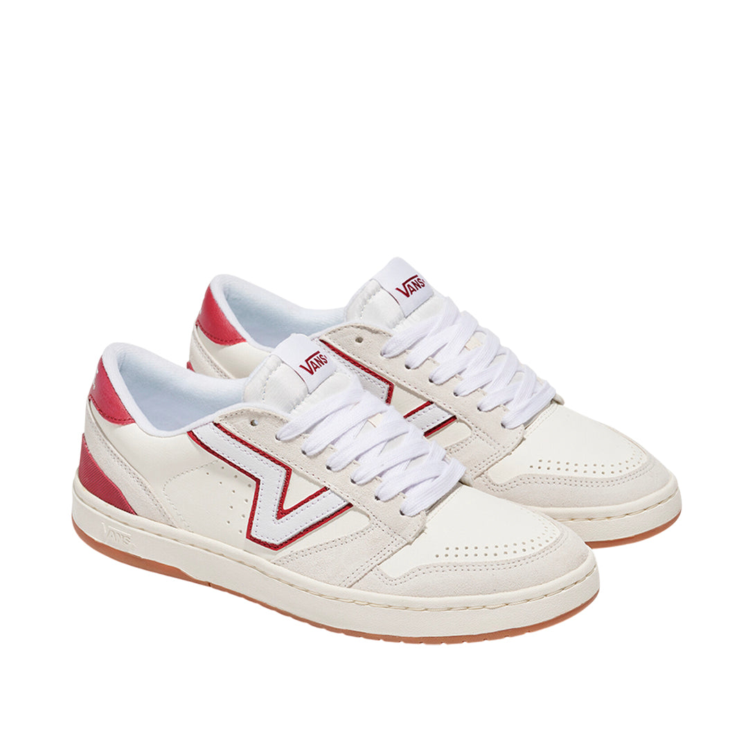 Tennis Lowland unisex color blanco y rojo, marca VANS. Inspirado en los 80, upper de cuero, cupsole y suela waffle híbrida. Logo Flying V.